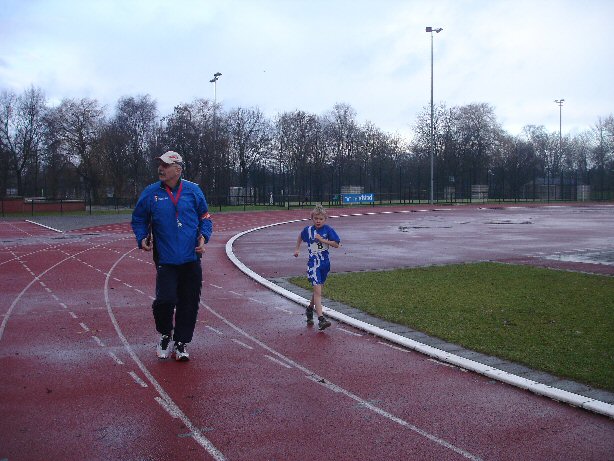 Om 12:00 uur verricht onze jarige starter Johan Jeukens het startschot. De kleine Tristan blijft op de atletiekbaan lopen en de rest verlaat het complex. Even kijk ik of alles naar behoren verloopt en dan heb ik moeite om de kleine Belg te achterhalen. Tjonge, wat gaat die er als een speer vandoor. Eenmaal bijgehaald, waarschuw ik hem dat hij zich niet moet opblazen. En Tristan neemt een tempo aan die iets rustiger is. Na een rondje afgelegd te hebben is het bereiken van dat record realistisch. Maar ja, instorten kan altijd en dan vervliegt zijn vurige wens. Als Tristan 600 meter achter de hielen heeft begint het te regenen. Ik dring aan om het tempo iets te verhogen, want ik wil voor de regen binnen zijn. En dan zie je zo’n jong heerlijk met z’n sport bezig zijn. Zeer gedreven gaat hij door en in de laatste bocht zet hij nogmaals aan om een betere tijd op de klok te krijgen. Dan passeert hij de eindstreep en z’n missie is geslaagd. De 6:12 wordt weggevaagd en Tristan laat een tijd van 5:38,4 neerzetten. Een dikke proficiat en hij kan uitblazen.