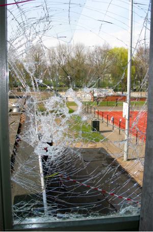 Wellicht uit teleurstelling over het niet kunnen binnendringen hebben de daders een grote betontegel gezocht, gevonden en gebroken. Met de brokstukken is het zijraam van onze kantine bekogeld, met het door mij gefotografeerde resultaat. Uiteraard heb ik zaterdag bij de politie aangifte gedaan. Zij hebben toegezegd nog vaker ons clubhuis in hun surveillance op te nemen. De ruit wordt binnenkort door het stadsdeel hersteld.